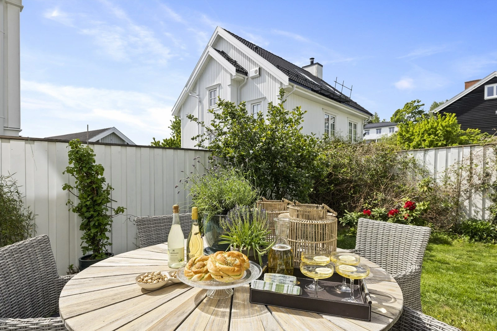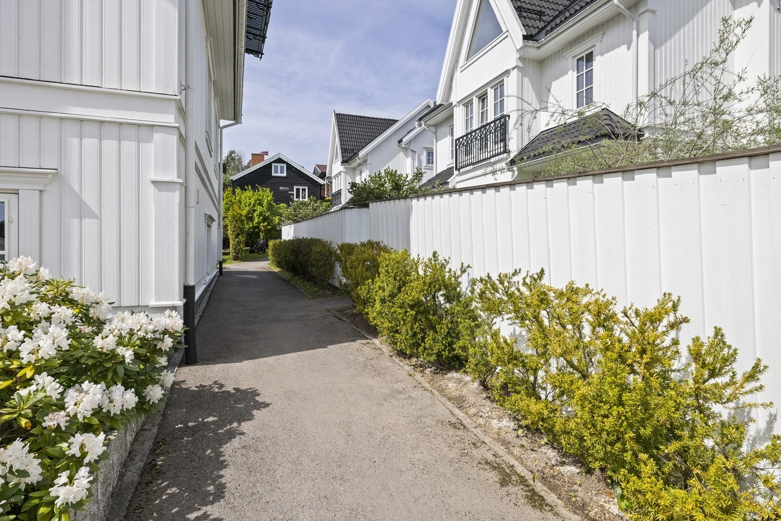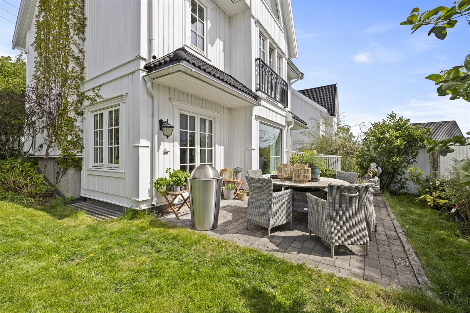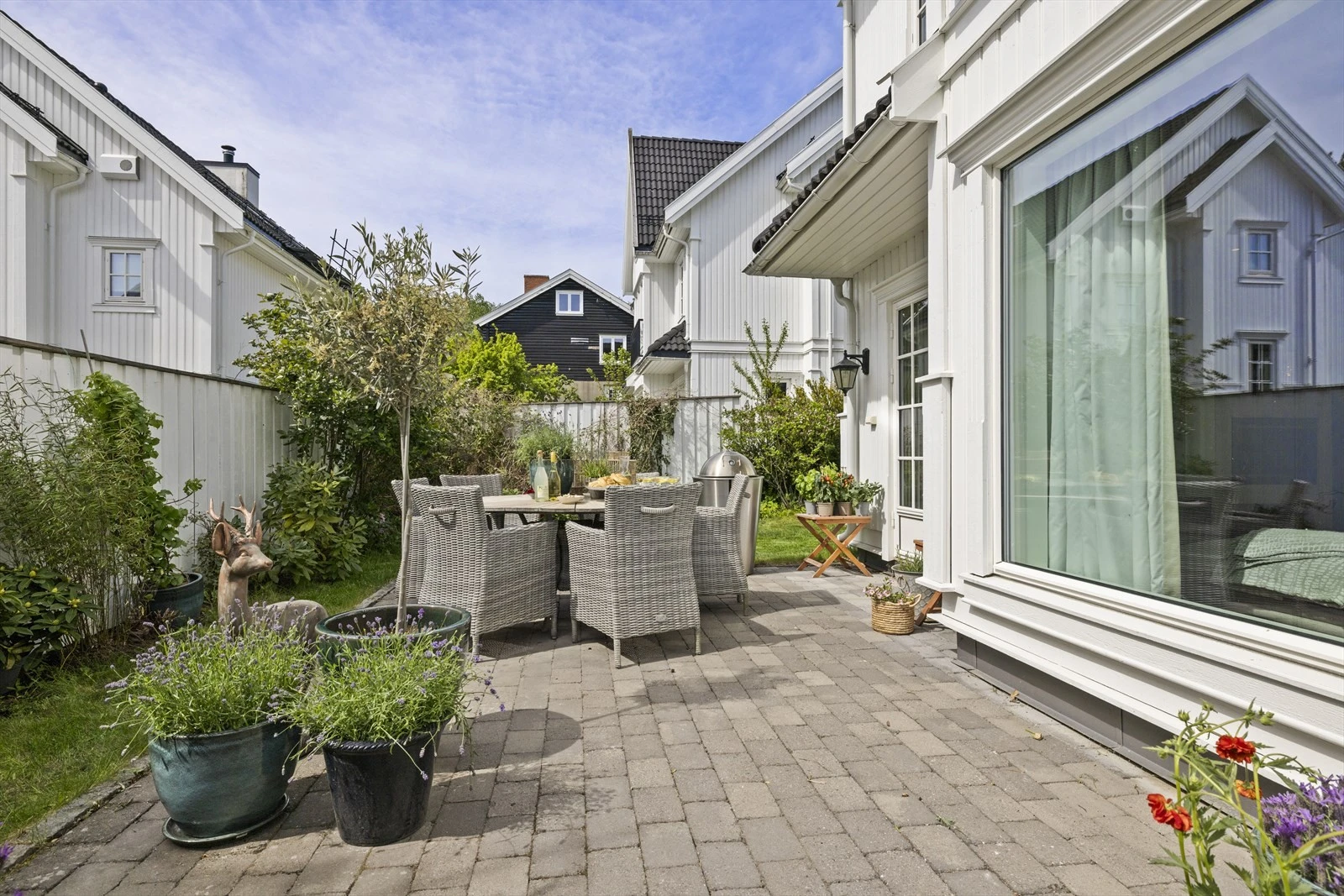 Boligene kombinerer et klassisk uttrykk med moderne komfort, hvor store vindusflater skaper en sømløs overgang mellom inne- og uterom. Hver bolig byr på flere innbydende uteplasser, perfekt integrert i arkitekturen for å skape lune og private soner. De skjermede hagene og terrassene gir optimale forhold for sol og utsikt, samtidig som de sikrer privatliv. Boligene er ikke bare estetisk tiltalende, men også funksjonelle, og er designet for å møte hverdagslivets behov og ønsker.